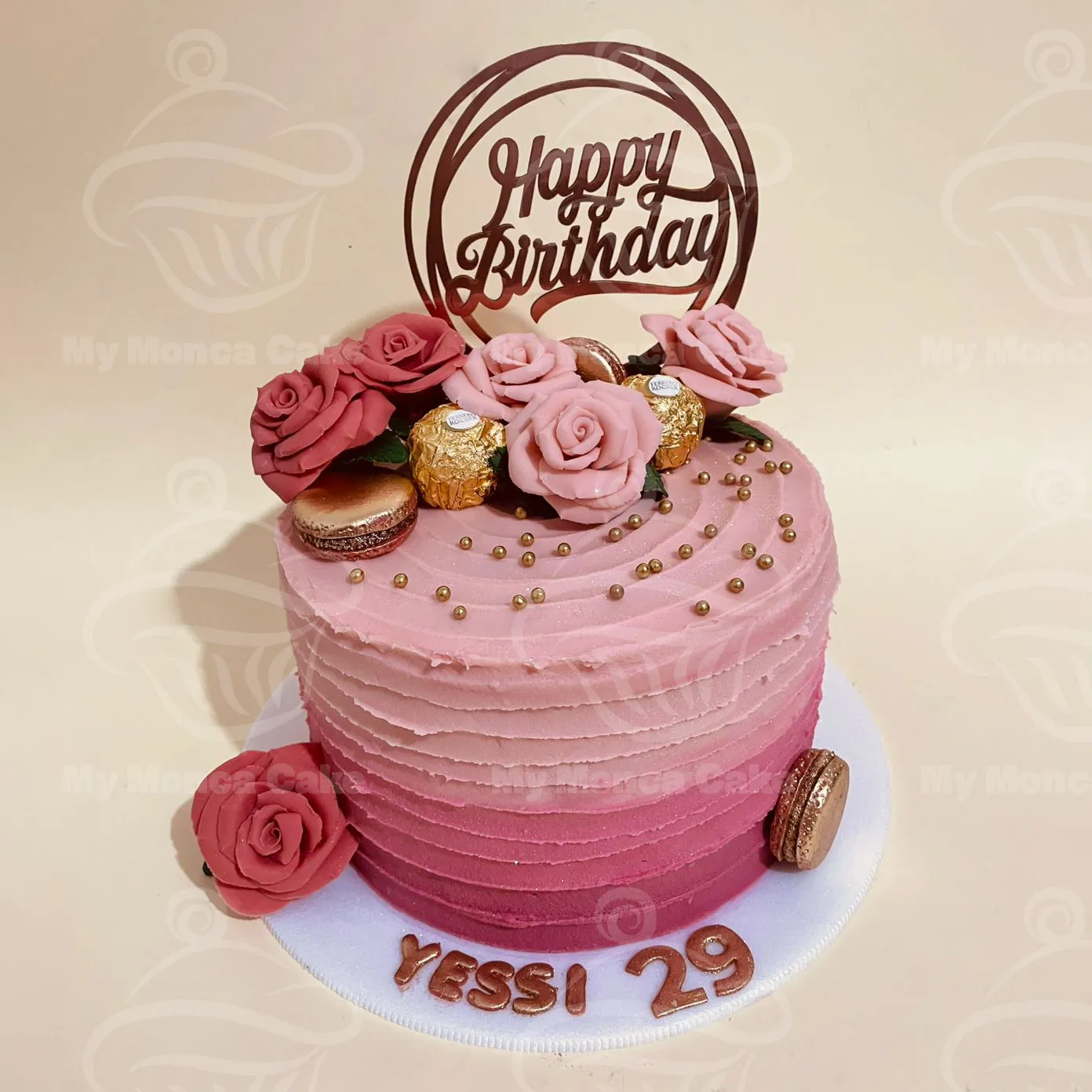 Cada cumpleaños es una oportunidad para celebrar con estilo, y en My Monca lo hacemos realidad a través de diseños únicos y personalizados. Esta torta, elaborada para Yessi en su cumpleaños número 29, es una verdadera joya visual, con un degradado en tonos rosados, detalles en dorado, rosas artesanales y decoración con macarons y bombones.